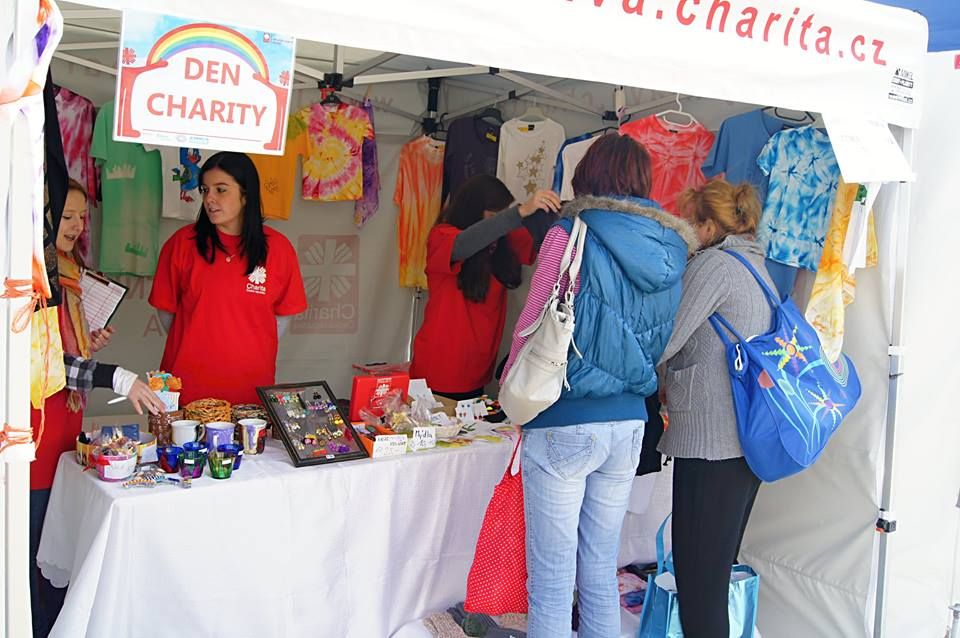 Charita zde prodávala výrobky svých uživatelů. Lidé si tu mohli koupit batikovaná trička, šperky, svíčky, mýdla, šátky, nebo i knoflík pro štěstí. Byly to výrobky, které vytvářejí uživatelé charitních služeb – senioři, mládež i lidé s postižením. K vidění byly také plakáty s fotografiemi a popisem činností jednotlivých služeb Charity.