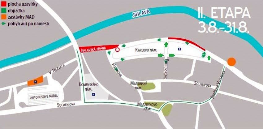 Kromě zavřené Jihlavské brány bude oproti předpokladu stále omezen průjezd spodní částí náměstí, od domu č. p. 21 po č. p. 33. Ani ve druhé etapě, která by měla trvat do konce srpna, nebude na náměstí zajíždět Městská autobusová doprava.